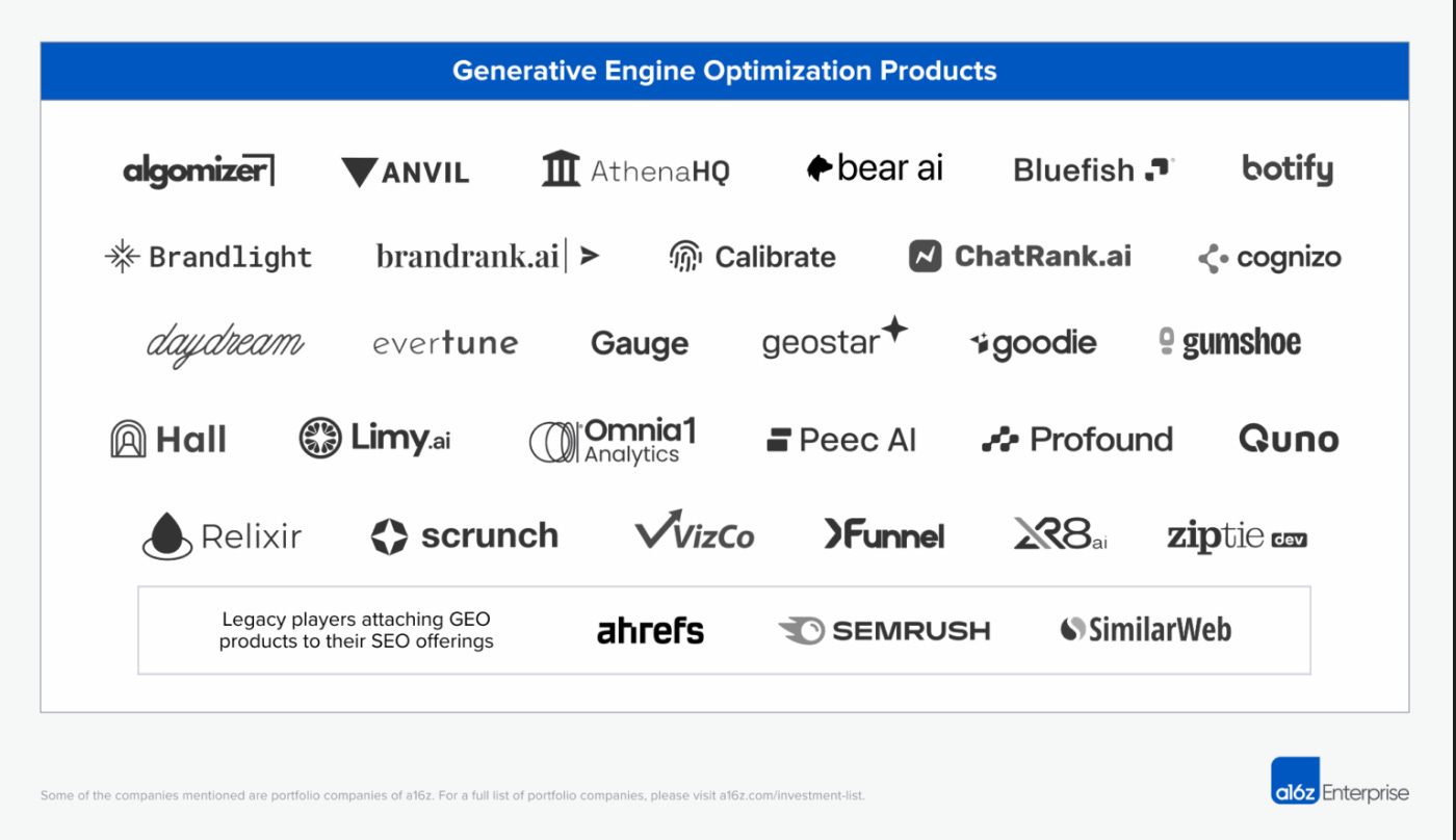 Everyone wants to influence AI outputs in ChatGPT, Claude, and Gemini, to the point there’s an a16z market map: